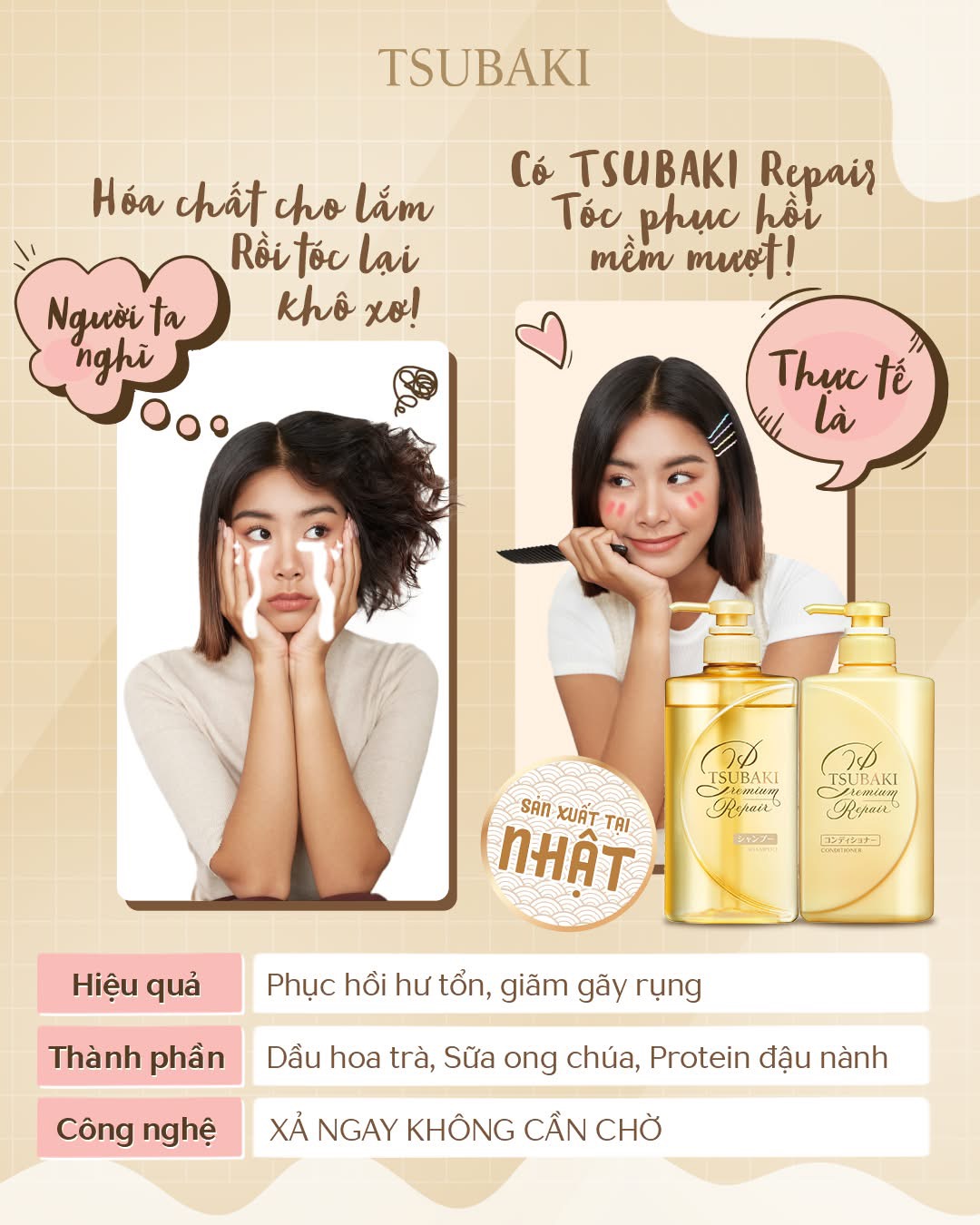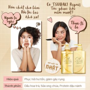 – Hệ dưỡng chất phục hồi: Dầu hoa trà Nhật, sữa ong chúa & protein đậu nành, nuôi dưỡng tóc chắc khỏe từ bên trong.